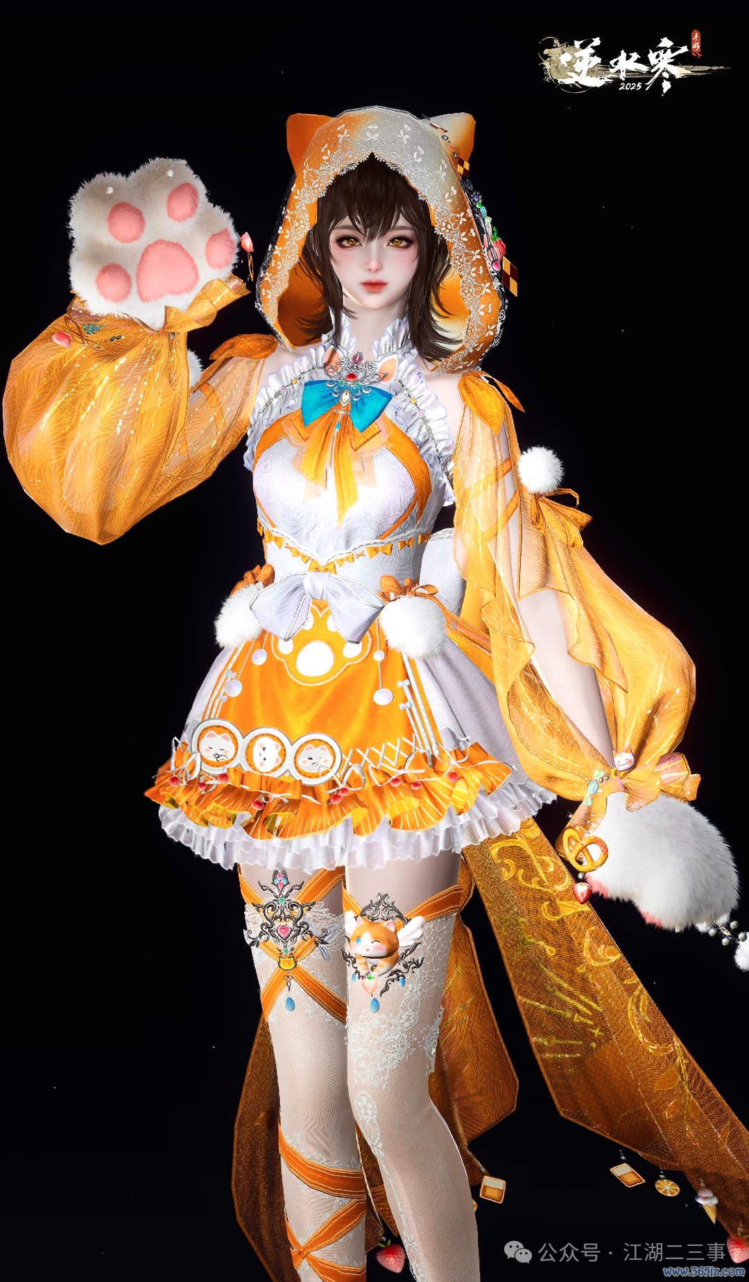 橘猫主题新时装【橘喵披霞】,本周四上架商城限时出售,售价980纹玉,支撑使用半价券及代金券,男女款均支撑剪辑,剪辑后可去掉手套,得到时装后可同步解锁配饰【甜梦奶芙】【喵仙之威】